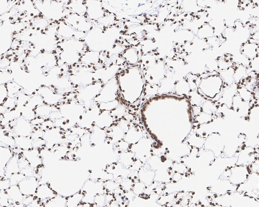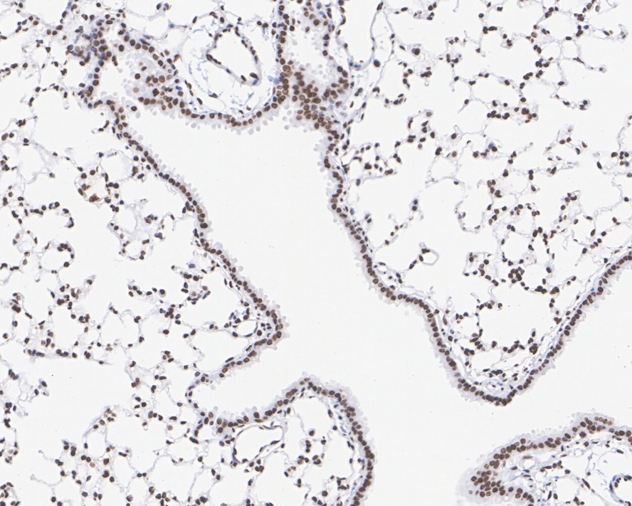 Immunohistochemical analysis of paraffin-embedded mouse lung tissue with Rabbit anti-SP1 antibody (HA750330) at 1/200 dilution.