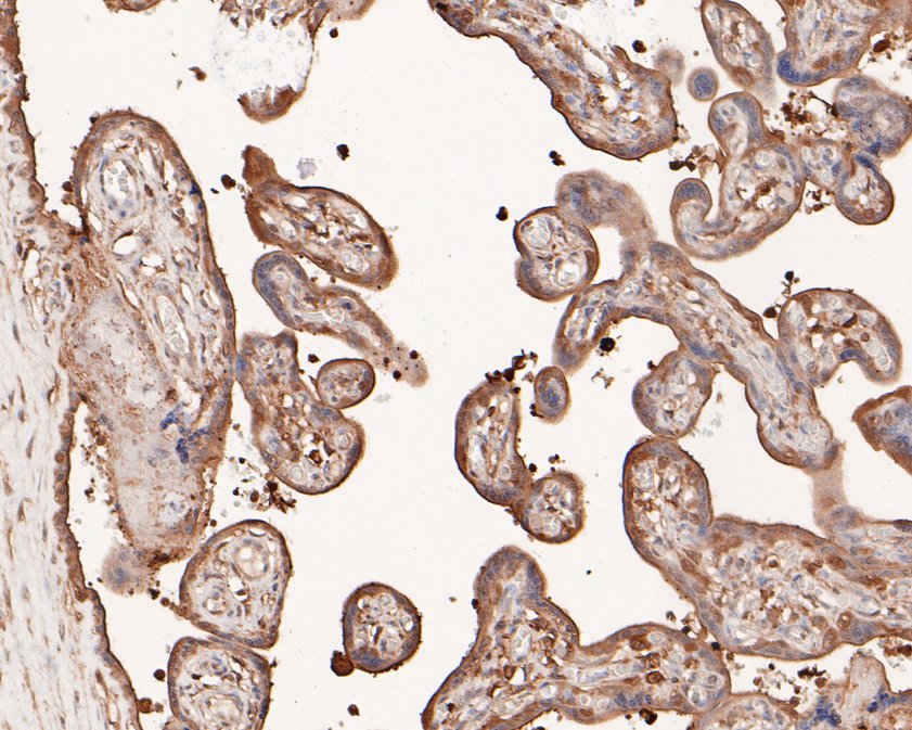 Immunohistochemical analysis of paraffin-embedded human placenta tissue using anti-SREBP1 antibody. The section was pre-treated using heat mediated antigen retrieval with sodium citrate buffer (pH 6.0) (high pressure) for 2 minutes. The tissues were blocked in 5% BSA for 30 minutes at room temperature, washed with ddH2O and PBS, and then probed with the primary antibody (HA500210, 1/400) for 30 minutes at room temperature. The detection was performed using an HRP conjugated compact polymer system. DAB was used as the chromogen. Tissues were counterstained with hematoxylin and mounted with DPX.