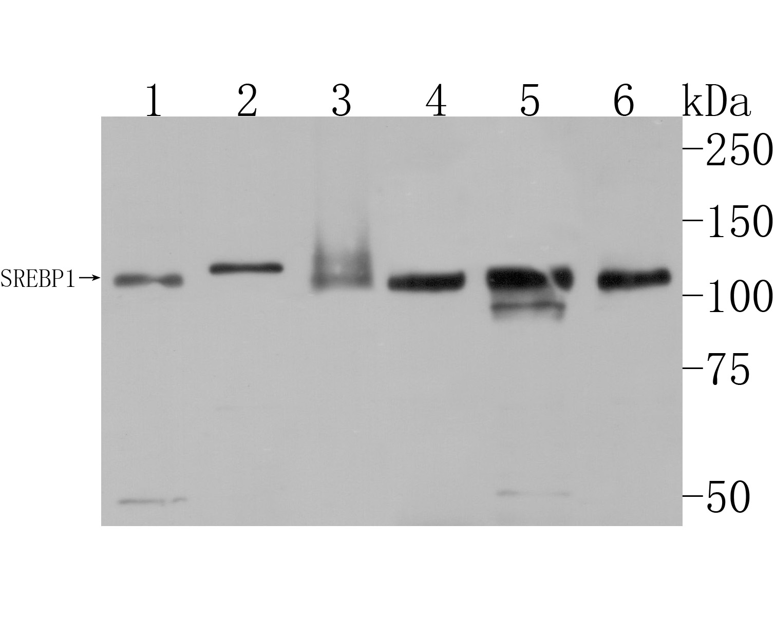 Western blot analysis of SREBP1 on different lysates with Rabbit anti-SREBP1 antibody (HA750968) at 1/2,000 dilution.