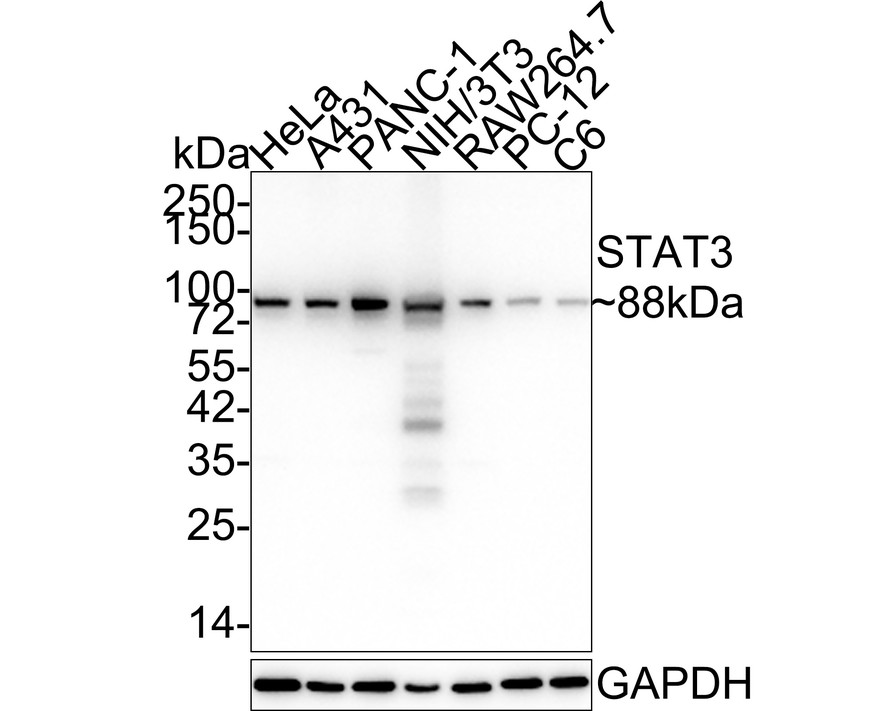 Western blot analysis of STAT3 on different lysates with Rabbit anti-STAT3 antibody (HA750120) at 1/2,000 dilution.