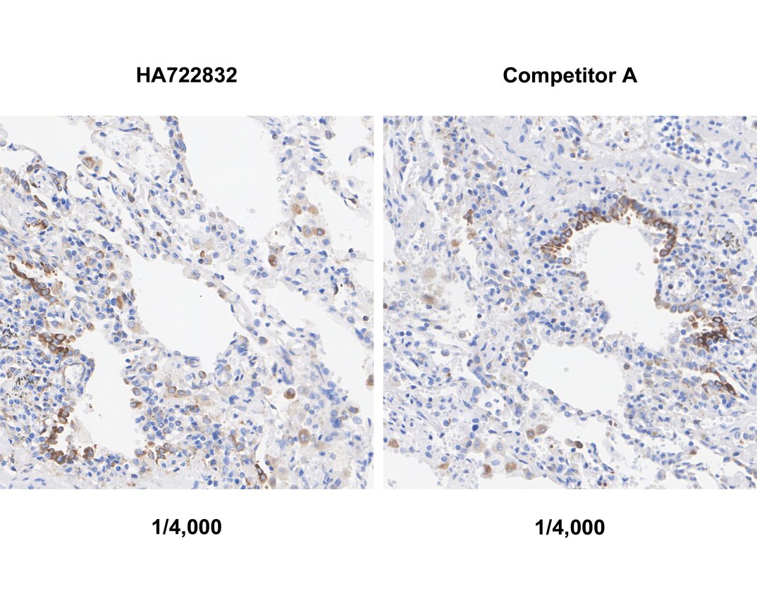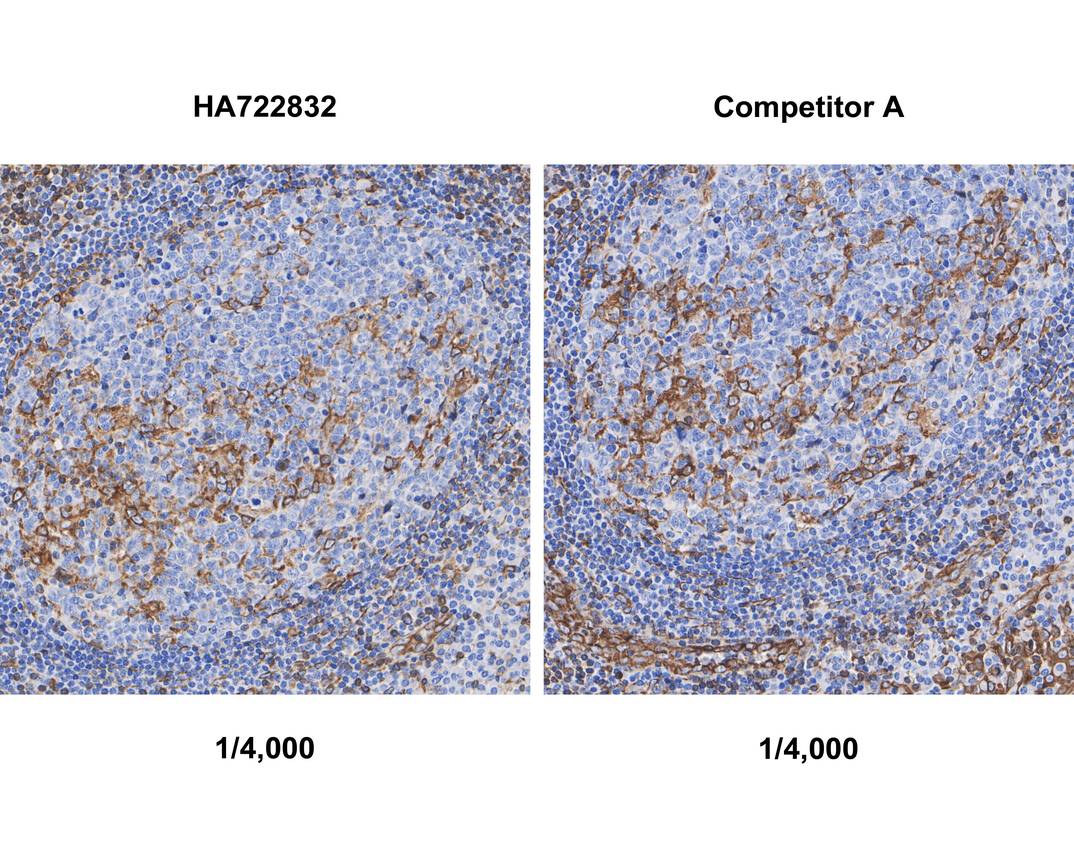 The section was pre-treated using heat mediated antigen retrieval with Tris-EDTA buffer (pH 9.0) for 20 minutes. The tissues were blocked in 1% BSA for 20 minutes at room temperature, washed with ddH2O and PBS, and then probed with the primary antibody (HA722832) at 1/4,000 dilution and competitor's antibody at 1/4,000 dilution for 1 hour at room temperature. The detection was performed using an HRP conjugated compact polymer system. DAB was used as the chromogen. Tissues were counterstained with hematoxylin and mounted with DPX.