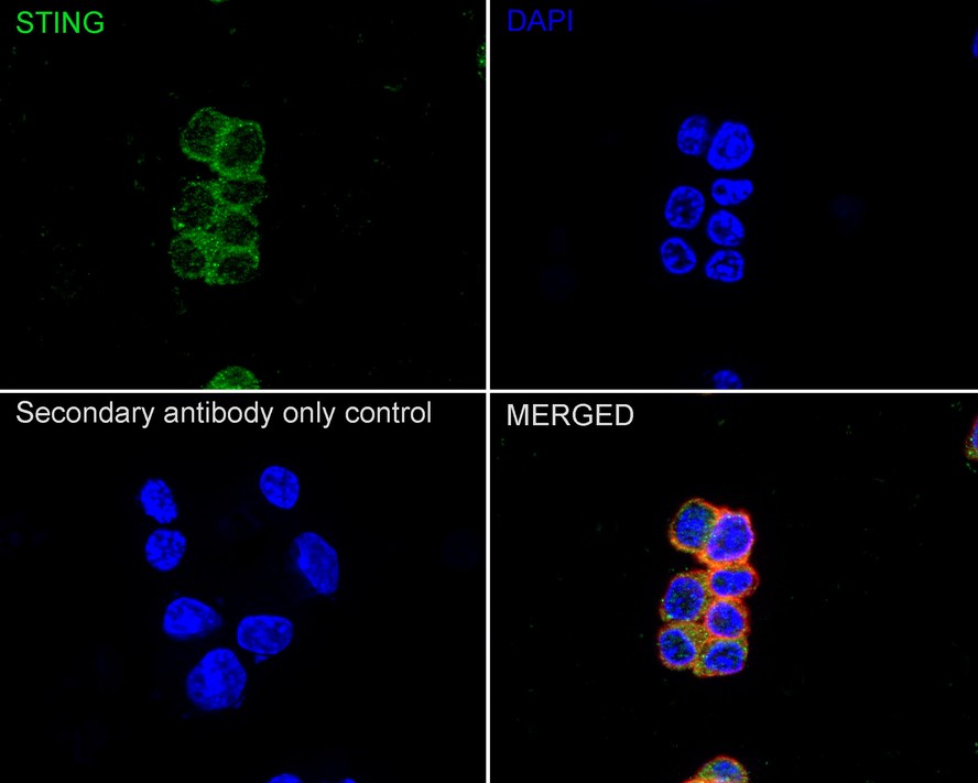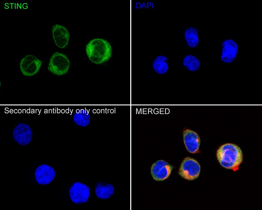 Cells were fixed in 4% paraformaldehyde for 20 minutes at room temperature, permeabilized with 0.1% Triton X-100 in PBS for 5 minutes at room temperature, then blocked with 1% BSA in 10% negative goat serum for 1 hour at room temperature. Cells were then incubated with Rabbit anti-STING antibody (HA722832) at 1/100 dilution in 1% BSA in PBST overnight at 4 ℃. Goat Anti-Rabbit IgG H&L (iFluor™ 488, HA1121) was used as the secondary antibody at 1/1,000 dilution. PBS instead of the primary antibody was used as the secondary antibody only control. Nuclear DNA was labelled in blue with DAPI.