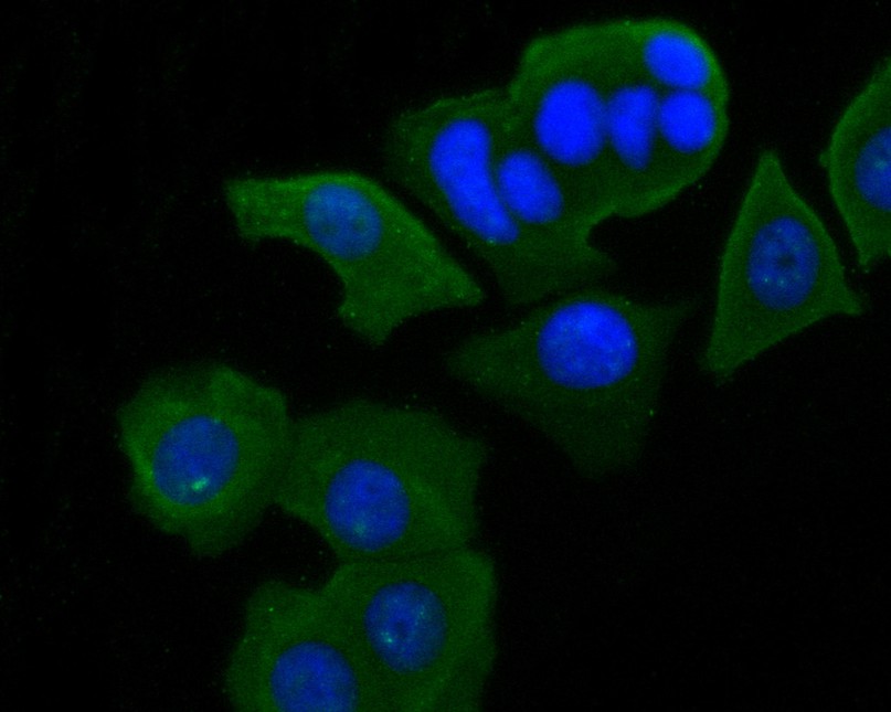 ICC staining of Syk in PANC-1 cells (green). Formalin fixed cells were permeabilized with 0.1% Triton X-100 in TBS for 10 minutes at room temperature and blocked with 1% Blocker BSA for 15 minutes at room temperature. Cells were probed with the primary antibody (HA500080, 1/50) for 1 hour at room temperature, washed with PBS. Alexa Fluor®488 Goat anti-Rabbit IgG was used as the secondary antibody at 1/1,000 dilution. The nuclear counter stain is DAPI (blue).