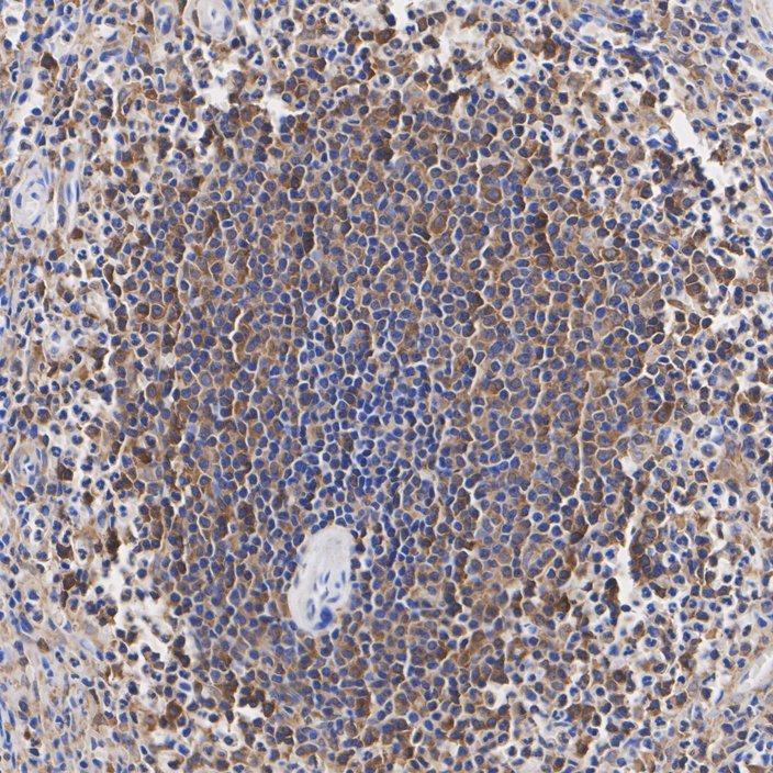 Immunohistochemical analysis of paraffin-embedded human spleen tissue with Rabbit anti-Syk antibody (HA500080) at 1/1,000 dilution.