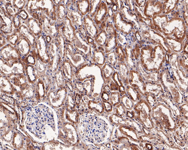 Immunohistochemical analysis of paraffin-embedded rat kidney tissue using anti-Syk antibody. The section was pre-treated using heat mediated antigen retrieval with Tris-EDTA buffer (pH 8.0-8.4) for 20 minutes.The tissues were blocked in 5% BSA for 30 minutes at room temperature, washed with ddH2O and PBS, and then probed with the primary antibody (HA500080, 1/200) for 30 minutes at room temperature. The detection was performed using an HRP conjugated compact polymer system. DAB was used as the chromogen. Tissues were counterstained with hematoxylin and mounted with DPX.