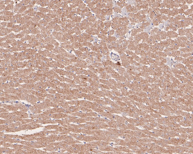 Immunohistochemical analysis of paraffin-embedded rat heart tissue using anti-Syk antibody. The section was pre-treated using heat mediated antigen retrieval with Tris-EDTA buffer (pH 8.0-8.4) for 20 minutes.The tissues were blocked in 5% BSA for 30 minutes at room temperature, washed with ddH2O and PBS, and then probed with the primary antibody (HA500080, 1/200) for 30 minutes at room temperature. The detection was performed using an HRP conjugated compact polymer system. DAB was used as the chromogen. Tissues were counterstained with hematoxylin and mounted with DPX.