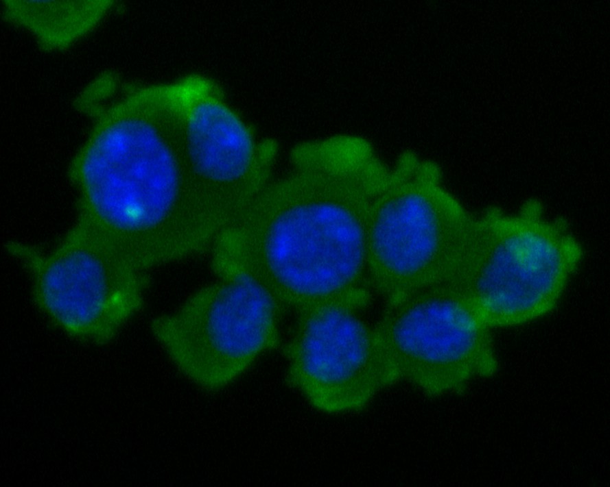 ICC staining of ZAC in SiHa cells (green). Formalin fixed cells were permeabilized with 0.1% Triton X-100 in TBS for 10 minutes at room temperature and blocked with 1% Blocker BSA for 15 minutes at room temperature. Cells were probed with the primary antibody (ER1901-48, 1/200) for 1 hour at room temperature, washed with PBS. Alexa Fluor®488 Goat anti-Rabbit IgG was used as the secondary antibody at 1/1,000 dilution. The nuclear counter stain is DAPI (blue).