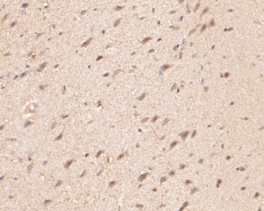 Immunohistochemical analysis of paraffin-embedded rat brain tissue using anti-ZAC antibody. The section was pre-treated using heat mediated antigen retrieval with Tris-EDTA buffer (pH 8.0-8.4) for 20 minutes.The tissues were blocked in 5% BSA for 30 minutes at room temperature, washed with ddH2O and PBS, and then probed with the primary antibody (ER1901-48, 1/200) for 30 minutes at room temperature. The detection was performed using an HRP conjugated compact polymer system. DAB was used as the chromogen. Tissues were counterstained with hematoxylin and mounted with DPX.