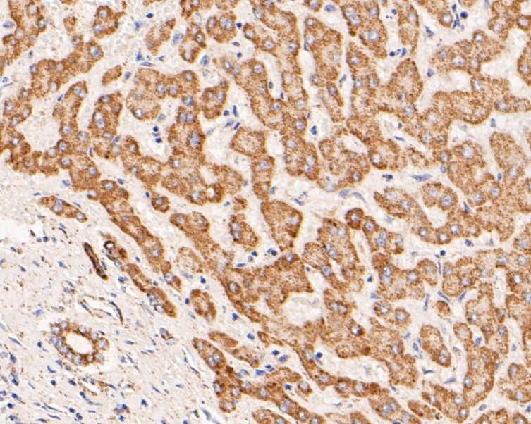 Immunohistochemical analysis of paraffin-embedded human liver tissue using anti-ZAC antibody. The section was pre-treated using heat mediated antigen retrieval with Tris-EDTA buffer (pH 8.0-8.4) for 20 minutes.The tissues were blocked in 5% BSA for 30 minutes at room temperature, washed with ddH2O and PBS, and then probed with the primary antibody (ER1901-48, 1/200) for 30 minutes at room temperature. The detection was performed using an HRP conjugated compact polymer system. DAB was used as the chromogen. Tissues were counterstained with hematoxylin and mounted with DPX.