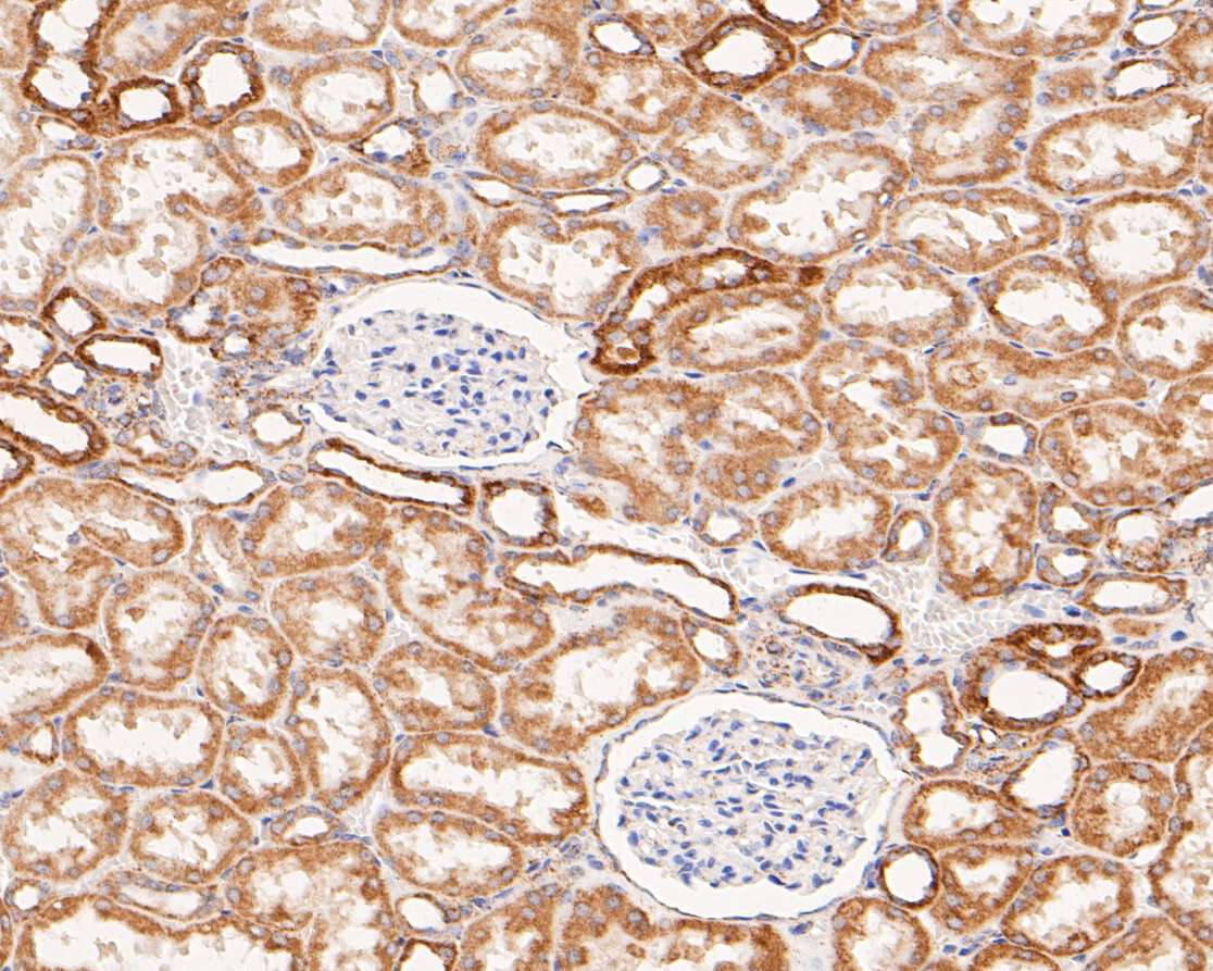 Immunohistochemical analysis of paraffin-embedded human kidney tissue using anti-ZAC antibody. The section was pre-treated using heat mediated antigen retrieval with Tris-EDTA buffer (pH 8.0-8.4) for 20 minutes.The tissues were blocked in 5% BSA for 30 minutes at room temperature, washed with ddH2O and PBS, and then probed with the primary antibody (ER1901-48, 1/200) for 30 minutes at room temperature. The detection was performed using an HRP conjugated compact polymer system. DAB was used as the chromogen. Tissues were counterstained with hematoxylin and mounted with DPX.
