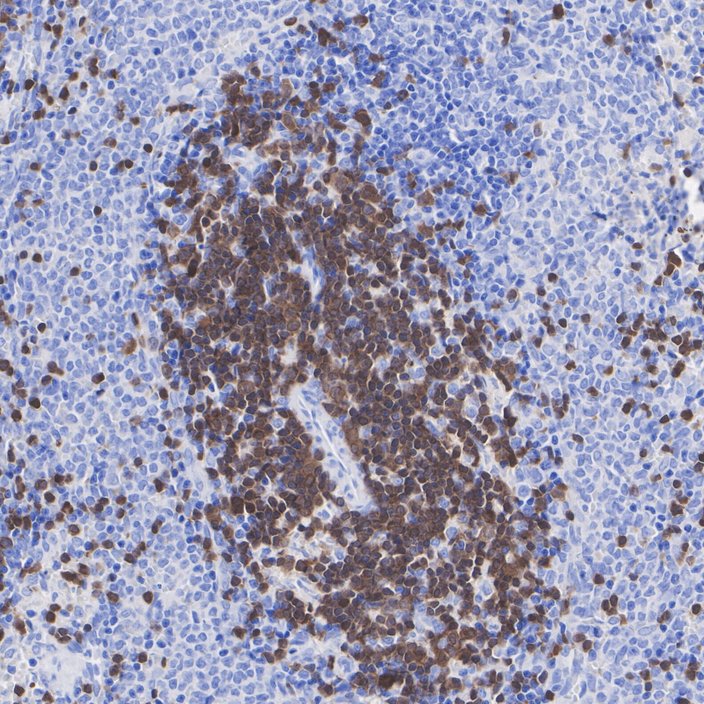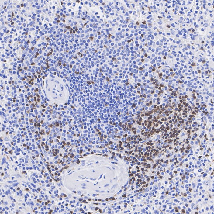 Immunohistochemical analysis of paraffin-embedded human spleen tissue with Rabbit anti-ZAP70 antibody (HA723344) at 1/1,000 dilution.