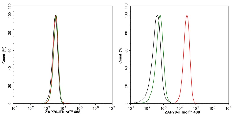 Flow cytometric analysis of Ramos (left, negative) and Jurkat (right, positive) cells labeling ZAP70.
