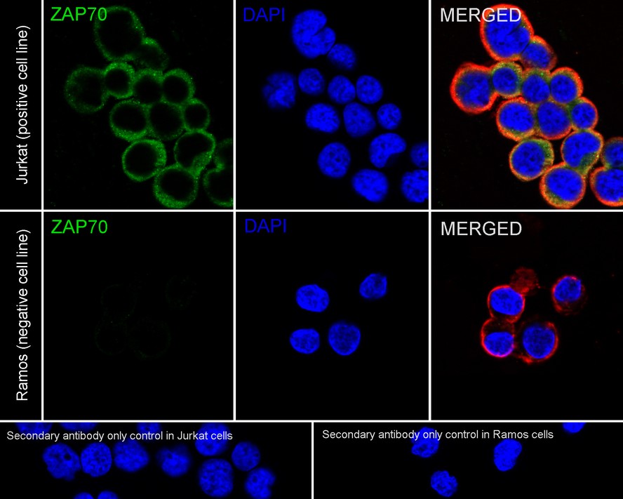 Cells were fixed in 4% paraformaldehyde for 15 minutes at room temperature, permeabilized with 0.1% Triton X-100 in PBS for 15 minutes at room temperature, then blocked with 1% BSA in 10% negative goat serum for 1 hour at room temperature. Cells were then incubated with Rabbit anti-ZAP70 antibody (HA723344) at 1/500 dilution in 1% BSA in PBST overnight at 4 ℃. Goat Anti-Rabbit IgG H&L (iFluor™ 488, HA1121) was used as the secondary antibody at 1/1,000 dilution. PBS instead of the primary antibody was used as the secondary antibody only control. Nuclear DNA was labelled in blue with DAPI.