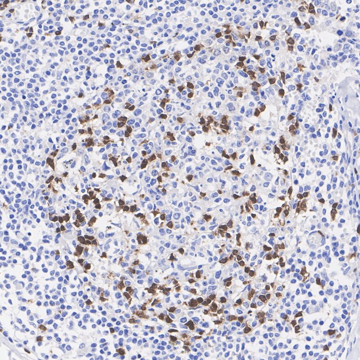 Immunohistochemical analysis of paraffin-embedded human lymph node tissue with Rabbit anti-ZAP70 antibody (HA723344) at 1/1,000 dilution.