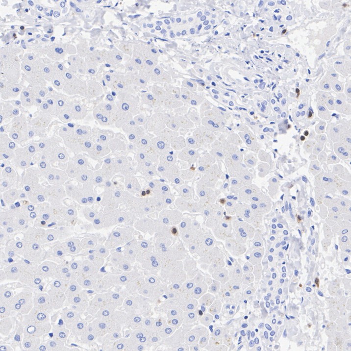 Immunohistochemical analysis of paraffin-embedded human liver tissue (negative) with Rabbit anti-ZAP70 antibody (HA723344) at 1/1,000 dilution.