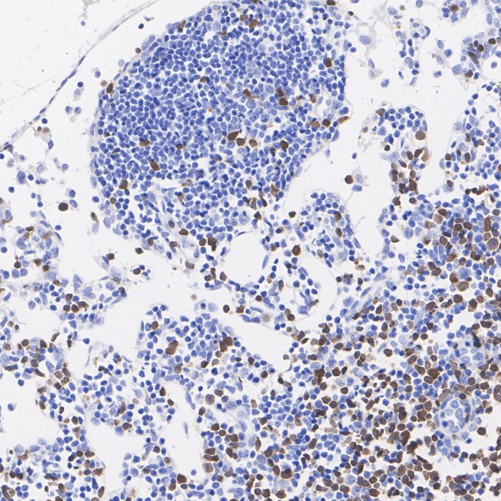 Immunohistochemical analysis of paraffin-embedded mouse spleen tissue with Rabbit anti-ZAP70 antibody (HA723344) at 1/1,000 dilution.