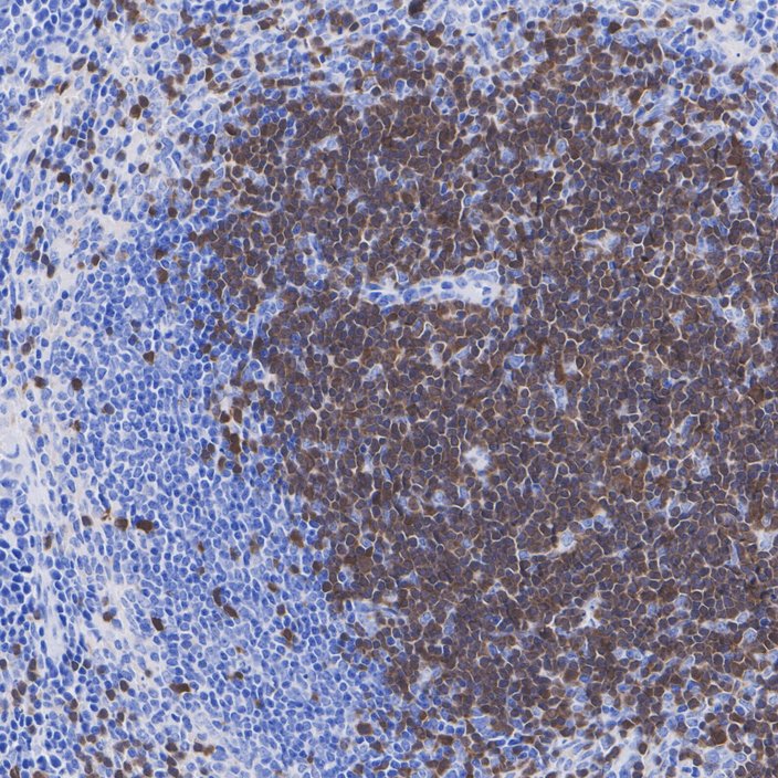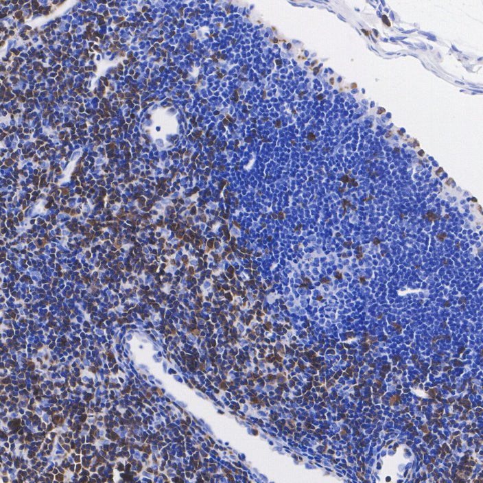 Immunohistochemical analysis of paraffin-embedded mouse lymph node tissue with Rabbit anti-ZAP70 antibody (HA723344) at 1/1,000 dilution.