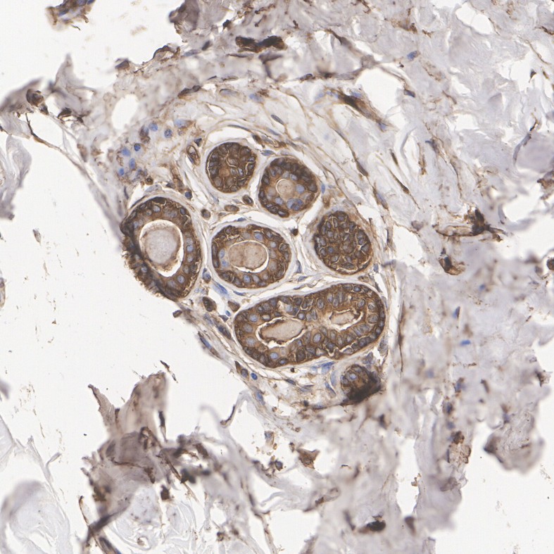 Immunohistochemical analysis of paraffin-embedded human breast cancer tissue with Rabbit anti-alpha Actinin antibody (ER1803-60) at 1/1,000 dilution.