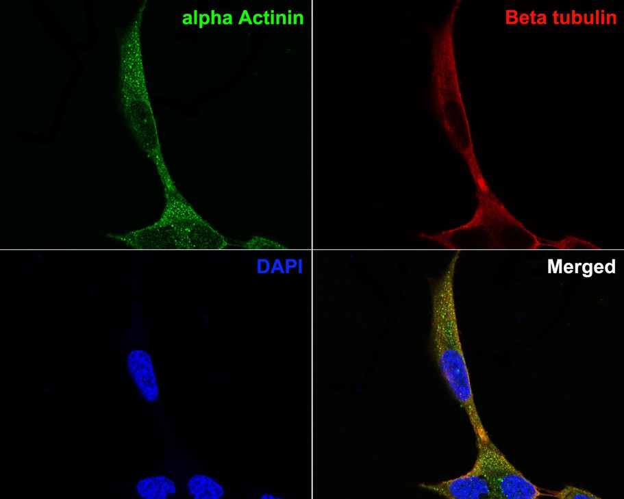 Immunocytochemistry analysis of SH-SY5Y cells labeling alpha Actinin with Rabbit anti-alpha Actinin antibody (ER1803-60) at 1/200 dilution.