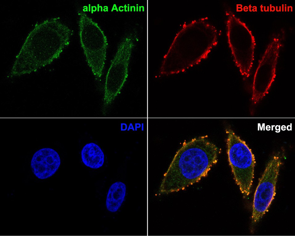 Immunocytochemistry analysis of Siha cells labeling alpha Actinin with Rabbit anti-alpha Actinin antibody (ER1803-60) at 1/200 dilution.