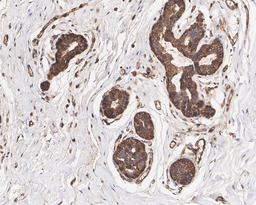 Immunohistochemical analysis of paraffin-embedded human breast tissue with Mouse anti-alpha Actinin antibody (HA610074) at 1/6,000 dilution.