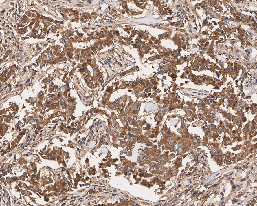 The section was pre-treated using heat mediated antigen retrieval with Tris-EDTA buffer (pH 9.0) for 20 minutes. The tissues were blocked in 1% BSA for 20 minutes at room temperature, washed with ddH2O and PBS, and then probed with the primary antibody (HA610074) at 1/6,000 dilution for 1 hour at room temperature. The detection was performed using an HRP conjugated compact polymer system. DAB was used as the chromogen. Tissues were counterstained with hematoxylin and mounted with DPX.