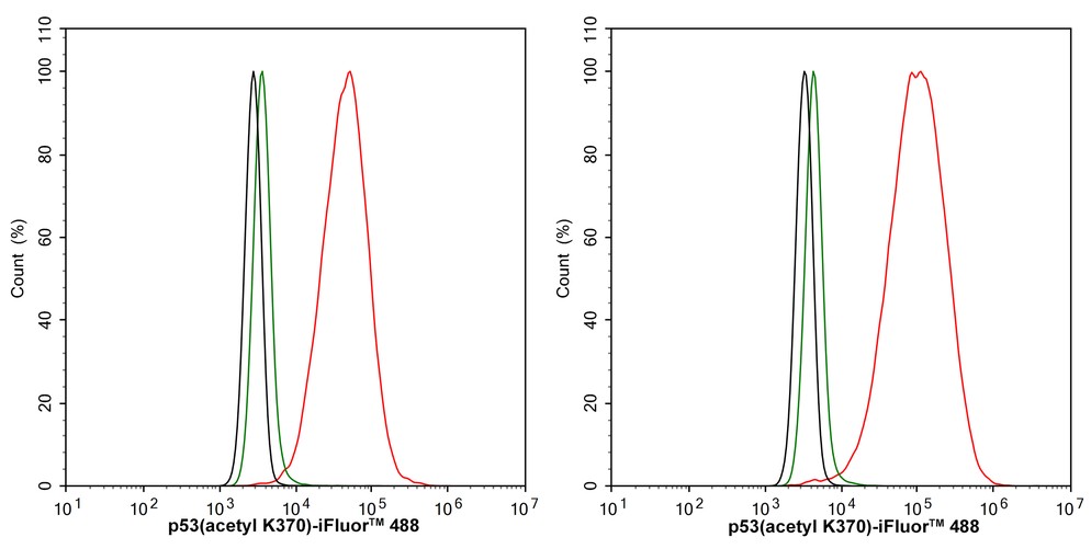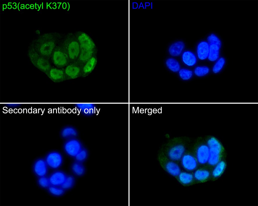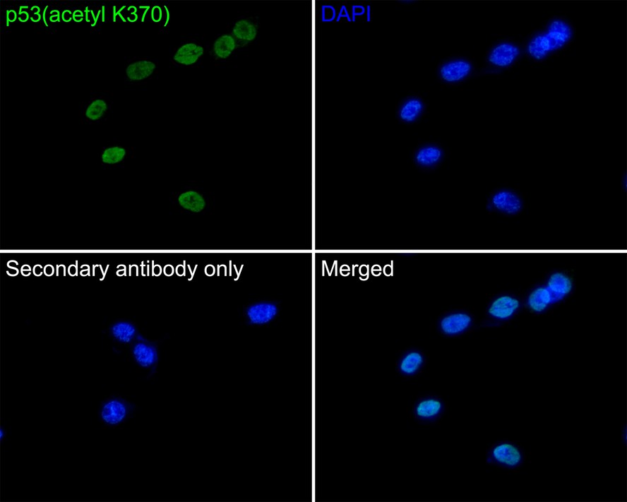 Cells were fixed in 4% paraformaldehyde for 10 minutes at 37 ℃, permeabilized with 0.05% Triton X-100 in PBS for 20 minutes, and then blocked with 2% negative goat serum for 30 minutes at room temperature. Cells were then incubated with Rabbit anti-p53 (acetyl K370) antibody (HA750047) at 1/50 dilution in 2% negative goat serum overnight at 4 ℃. Goat Anti-Rabbit IgG H&L (iFluor™ 488, HA1121) was used as the secondary antibody at 1/1,000 dilution. PBS instead of the primary antibody was used as the secondary antibody only control. Nuclear DNA was labelled in blue with DAPI. -