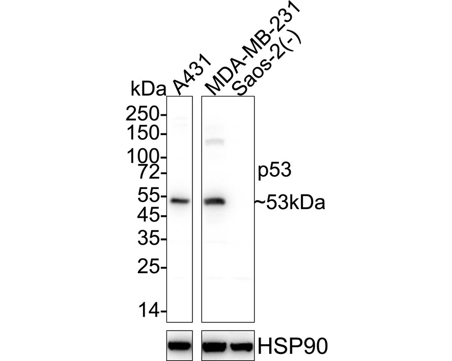 Western blot analysis of p53 on different lysates with Mouse anti-p53 antibody (HA610187) at 1/1,000 dilution.
