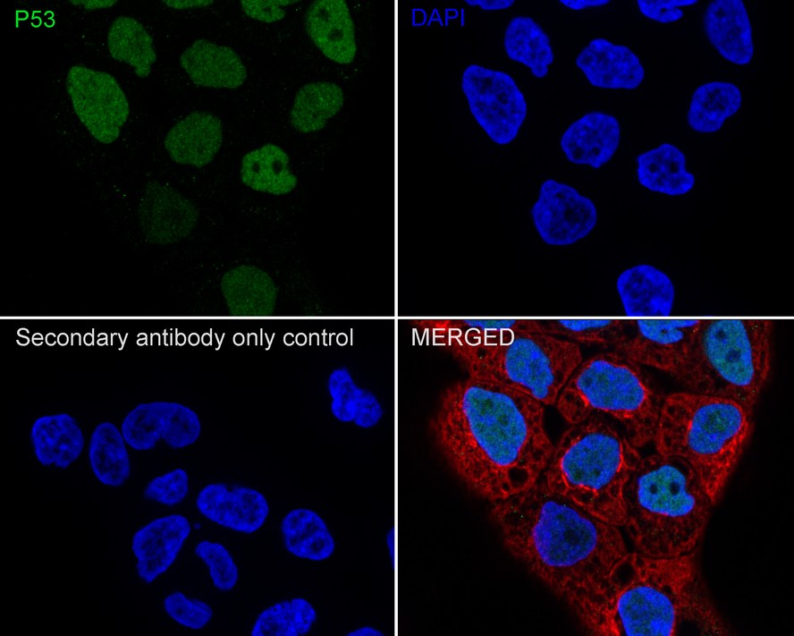 Cells were fixed in 4% paraformaldehyde for 20 minutes at room temperature, permeabilized with 0.1% Triton X-100 in PBS for 5 minutes at room temperature, then blocked with 1% BSA in 10% negative goat serum for 1 hour at room temperature. Cells were then incubated with Mouse anti-p53 antibody (HA610187) at 1/100 dilution in 1% BSA in PBST overnight at 4 ℃. Goat Anti-Mouse IgG H&L (iFluor™ 488, HA1125) was used as the secondary antibody at 1/1,000 dilution. PBS instead of the primary antibody was used as the secondary antibody only control. Nuclear DNA was labelled in blue with DAPI.
