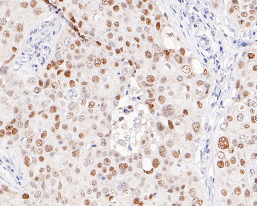 Immunohistochemical analysis of paraffin-embedded human breast cancer tissue with Rabbit anti-p53 antibody (HA750545) at 1/1,000 dilution.
