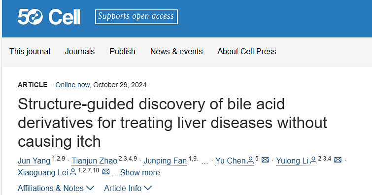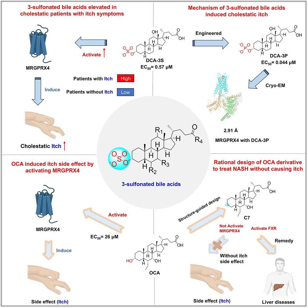 慢性瘙痒是一种使人衰弱的症状,会严重影响胆汁淤积等肝病患者的生活质量。胆汁酸(BAs)激活人G蛋白偶联受体MRGPRX4(hX4)与促进胆汁淤积性瘙痒有关。然而,详细的潜在机制仍然难以捉摸。 2024年10月29日,北京大学雷晓光、李毓龙、首都医科大学陈煜共同通讯在Cell杂志在线发表了题为“Structure-guided discovery of bile acid derivatives for treating liver diseases without causing itch”的研究论文,该研究揭示了用于治疗肝脏疾病而不引起瘙痒的胆汁酸衍生物。在这里,研究人员发现3-硫酸酸化BAs在有瘙痒症状的胆汁淤积症患者中升高。该研究解决了hX4-Gq与3-磷酸脱氧胆酸(DCA-3P)配合物的冷冻电镜结构,3-磷酸脱氧胆酸是内源性3-硫酸脱氧胆酸(DCA-3S)的模拟物。该结构揭示了MRGPR家族蛋白中前所未有的配体结合袋,突出了BAs上的3-羟基(3-OH)基团在激活hX4中的关键作用。在此结构信息的指导下,设计并开发了化合物7 (C7),一个缺乏3-OH的BA衍生物。值得注意的是,C7可有效缓解肝脏疾病模型的肝损伤和纤维化,同时显著减轻瘙痒副作用。