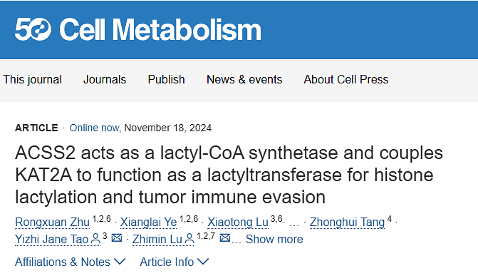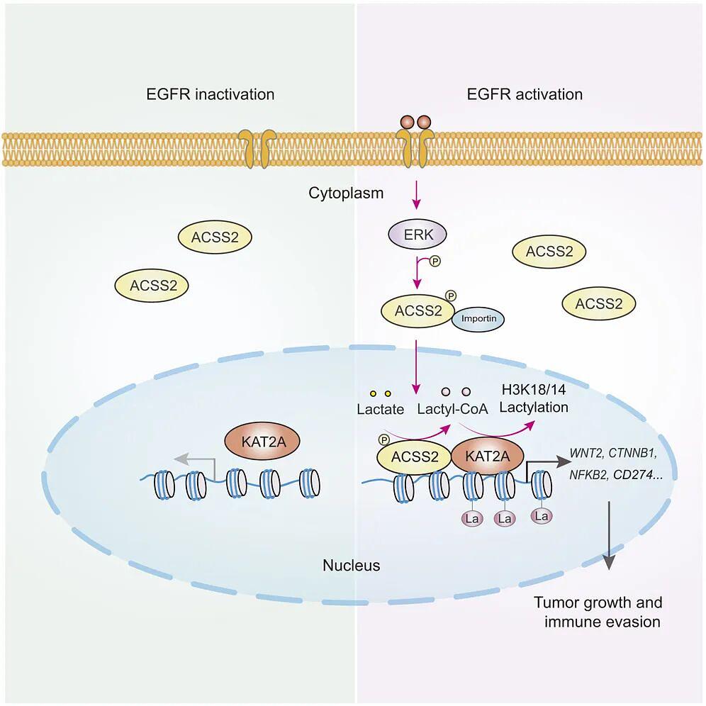 11月18日,浙江大学转化医学研究院、浙江大学医学院附属第一医院、国家基础科学中心及浙江大学基础交叉研究院的吕志民教授团队与Rice University 陶一之团队合作,在Cell Metabolism期刊上发表了全新研究论文,该研究首次发现了哺乳动物细胞中的乳酰辅酶A合成酶——ACSS2,其能够将乳酸脱氢酶A(LDHA)产生的乳酸直接转化为乳酰辅酶A。当表皮生长因子(EGF)激活EGFR通路时,ERK磷酸化介导的ACSS2核转位促进了LDHA/ACSS2/KAT2A复合物的形成。该复合物可以充当乳酰转移酶的作用,促进组蛋白乳酸化、基因表达、肿瘤生长和免疫逃逸。