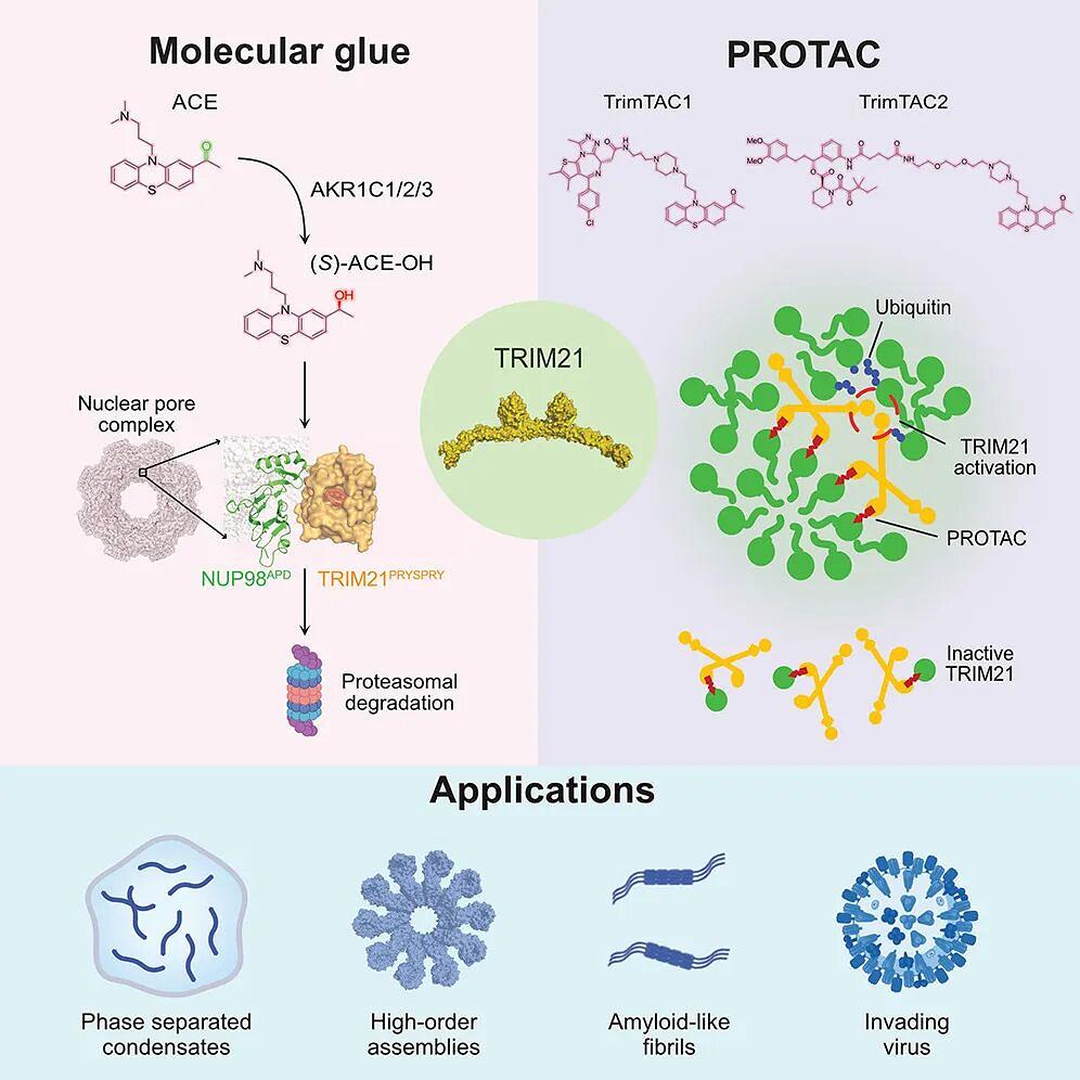 研究人员通过X射线晶体衍射获得了乙酰丙嗪及其代谢产物与TRIM21的共晶结构,为新配体的开发和PROTAC的设计提供了方向。根据晶体结构设计了基于TRIM21的PROTAC(命名为TrimTAC)。通过对比TrimTAC和传统的基于CRBN的PROTAC的细胞活性,发现TrimTAC不能降解单体蛋白,但能降解聚集形式的蛋白;而基于CRBN的PROTAC不具备上述选择性。这一特性来源于TRIM21的本身性质:与多聚的靶蛋白结合后,TRIM21的RING结构域二聚,才能激活其E3泛素连接酶的活性。为了验证TrimTAC在疾病治疗方面的应用前景,研究人员使用TrimTAC实现了胞质DNA诱导的cGAS聚集体的选择性降解,从而为TrimTAC治疗自身免疫性疾病提供了潜在应用场景。