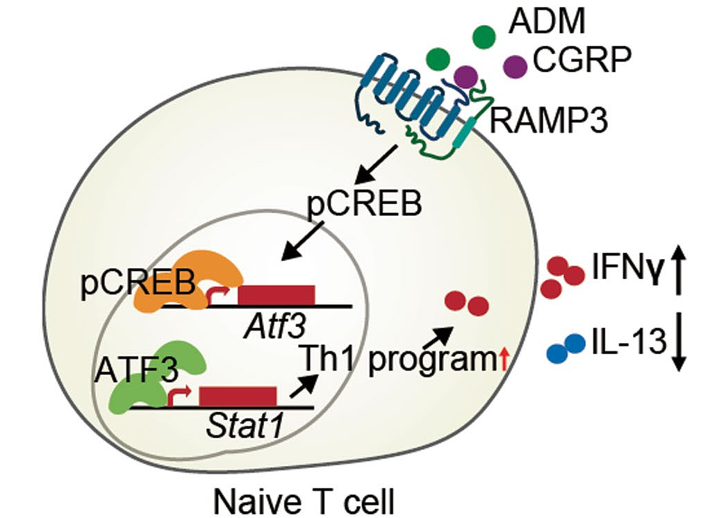 接着,研究者确认了神经递质CGRP同样可以促进Th1细胞的分化,这与鉴定的RAMP3在T细胞中的调控作用一致。进一步运用RAMP3基因敲除的T细胞,研究者揭示了CGRP是通过T细胞表达RAMP3发挥调节作用。转录组测序显示CGRP激活T细胞中第二信使cAMP通路,cAMP的作用与CGRP高度一致,同样可以促进Th1细胞的分化。结合CUT&Tag测序,luciferase,western等实验,研究者进一步探究了CGRP通过RAMP3调控T细胞分化的作用机制:CGRP-RAMP3轴激活下游pCREB的表达,从而激活转录因子ATF3的表达,ATF3通过顺式作用上调Th1分化的关键转录因子STAT1的表达,从而促进T细胞向Th1亚群分化。