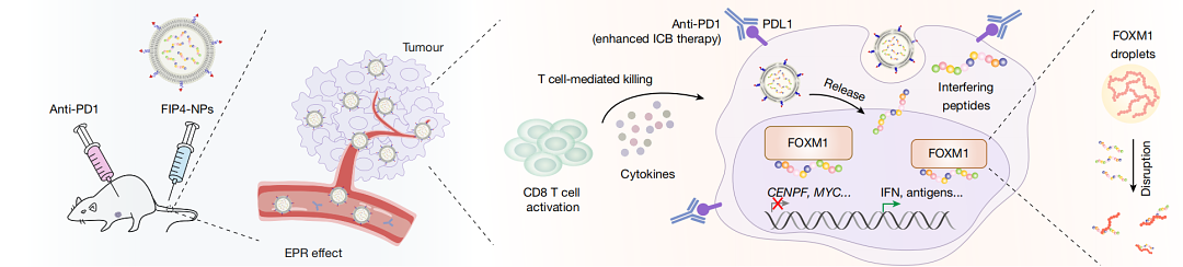 该研究通过筛选乳腺肿瘤细胞中的相分离蛋白,确定叉头(FKH)盒蛋白M1 (FOXM1)为最具潜力的候选物。致癌性FOXM1通过与FKH共识DNA元件的液-液相分离(LLPS)过程,划分了细胞核中的转录装置,进而维持了染色质的可及性,并对肿瘤的转移生长起到了关键作用。 此外,通过筛选表观遗传学化合物文库确定AMPK激动剂是FOXM1缩合的抑制剂。AMPK在固有无序区(IDR)磷酸化FOXM1,干扰缩合物,减少致癌转录,积累双链DNA以刺激先天免疫反应,并赋予离散的FOXM1激活免疫原性相关基因表达的能力。 研究人员通过开发一种遗传密码扩展的正交系统,证明了在特定IDR1位点的磷酰基部分引发静电排斥,从而有效消除了FOXM1的LLPS。同时,研究团队还设计了一种靶向IDR1并携带AMPK磷酸化残基的磷酸模拟肽(FIP4),用于进一步破坏FOXM1的LLPS。富含FIP4的纳米颗粒(FIP4-NPs)在抑制肿瘤恶性进展、恢复肿瘤免疫原性和改善肿瘤免疫治疗方面显示出良好前景。总之,这些发现不仅为FOXM1的功能与机制提供了新的深刻见解,还为临床应用开发了具有广阔前景的方法。