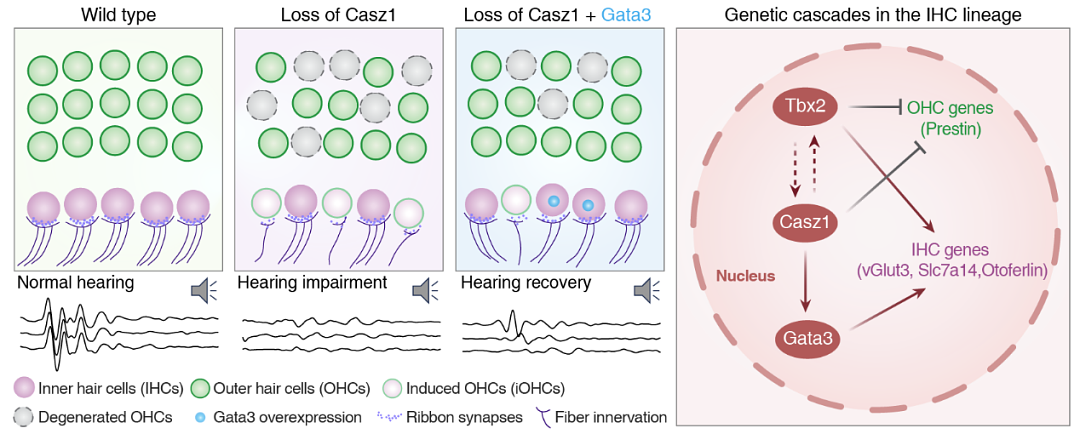 缺失Casz1导致IHC转分化为iOHC并伴随OHC死亡。Gata3作为Casz1的下游效应分子,其过表达可缓解Casz1缺失引起的HC异常,并部分恢复小鼠听力。Tbx2通过上位调节 Casz1促进IHC基因表达并抑制OHC基因表达,同时Casz1也可能间接调控Tbx2表达。