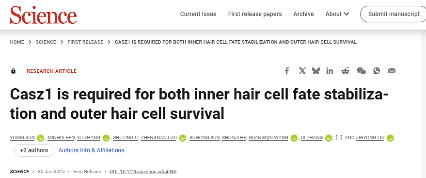 2025 年 1 月 30 日,中国科学院脑科学与智能技术卓越创新中心(神经科学研究所)刘志勇团队(博士后孙雨薇为第一作者)在国际顶尖学术期刊 Science 上发表了题为:Casz1 is required for both inner hair cell fate stabilization and outer hair cell survival 的研究论文。该项研究报道了锌指转录因子 Casz1 在听觉毛细胞(hair cell,HC)命运稳定与生存维持中的双重作用,并解析了 Casz1 发挥功能的分子机制,为探索基因操纵修复听觉损伤提供了新的思路和靶点。