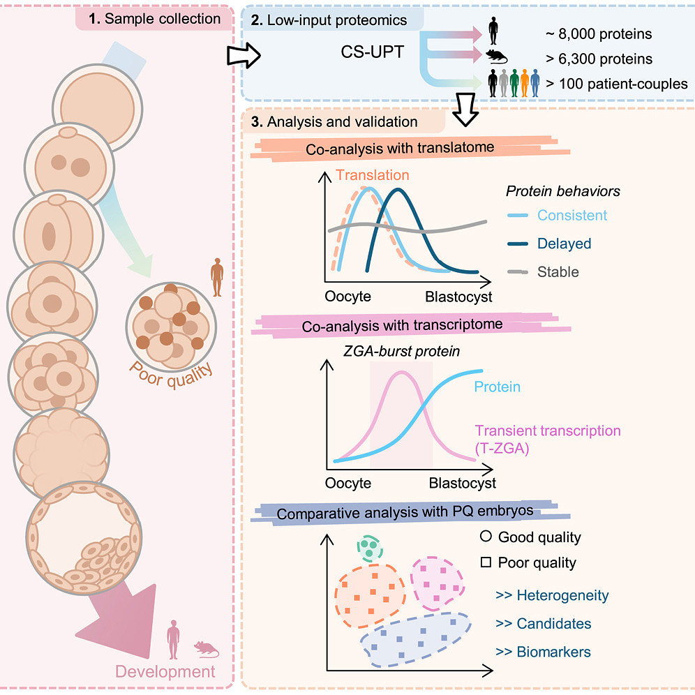 哺乳动物着床前胚胎发育包含受精、合子基因组激活(ZGA)、滋养层细胞和内细胞团的分化(第一次谱系分化)等关键生物学事件。近年来,随着单细胞/微量核酸测序组学技术的迅速发展,科学家们在早期胚胎转录组、表观组和翻译组的解析方面取得了显著进展,这些新发现极大地推动了对哺乳动物着床前胚胎发育的理解。现有研究表明,在早期胚胎发育阶段,转录和翻译之间存在显著的解偶联调控。作为细胞功能的主要分子基础,蛋白质的全面深入研究对于理解早期胚胎发育具有重要意义。然而,由于蛋白质缺乏类似核酸的可扩增特性,先前的胚胎蛋白质组学研究通常需要大量胚胎样本,且蛋白质鉴定的深度较为有限。目前,只有少数研究从蛋白质组的角度对早期胚胎发育进行了阐述。 2025年1月23日,中国科学院脑智卓越中心/上海脑科学与类脑研究中心刘真、孙怡迪、朱文成,复旦大学附属中山医院生殖医学中心木良善,以及上海交通大学医学院李辰合作在Cell在线发表了题为Comparative proteomic landscapes elucidate human preimplantation development and failure的研究论文。在这项工作中,研究团队优化了此前开发的超灵敏蛋白质组学技术体系,并通过低投入的样本描绘了人类和小鼠着床前胚胎的深度蛋白质组景观图谱。团队结合跨物种比较和多组学整合分析,系统性地解读了哺乳动物早期胚胎发育的过程,并围绕临床上常见的低质量胚胎的形成进行了单胚胎蛋白质组分析。 该研究为理解哺乳动物着床前胚胎发育提供了跨物种的新资源,为通过多组学解析早期胚胎发育机制提供了新思路,也为研究人类着床前胚胎发育失败建立了新范式。