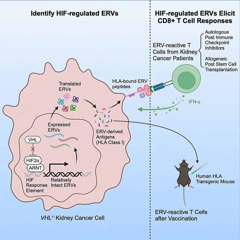 二十多年前,美国国立卫生研究院(NIH)Richard Childs团队开展了一项具有里程碑意义的临床研究,他们在74例晚期肾癌患者中进行了异基因干细胞移植(allo-SCTs)治疗,结果显示近50%的患者对治疗产生应答,其中11.7%达到完全缓解(CR)。在机制探索中,研究人员发现一例完全缓解患者的供体来源T细胞能够特异性识别并杀伤表达ERV(ERVE-4)衍生抗原肽的肿瘤细胞。值得注意的是,ERVE-4在ccRCC中呈现特异性表达模式,且其表达受HIF2调控,这一发现为解释ERVE-4在ccRCC中的选择性上调提供了分子基础。基于这些突破性发现,研究人员提出ERVE-4可能只是HIF2调控网络中众多具有免疫原性ERVs的代表性成员之一。