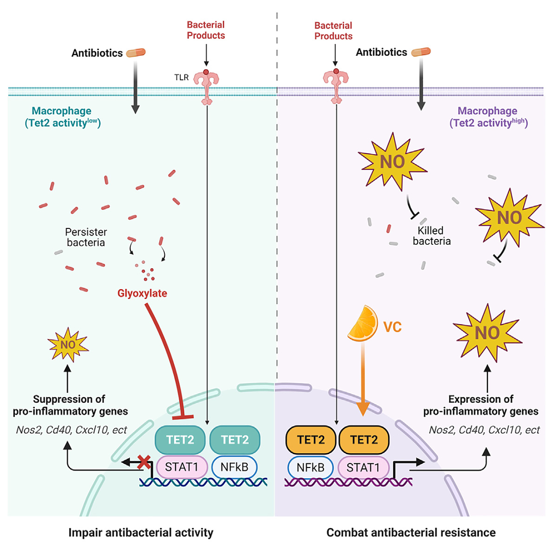 在体内实验中,研究团队通过外源性补充维生素C激活TET2酶活,并联合抗生素治疗,显著减少了持留菌在小鼠各器官的定植和存活。值得注意的是,维生素C与抗生素的联合疗法不仅延缓了细菌感染的复发,还显著延长了感染小鼠的生存期。这一疗效仅在野生型小鼠中观察到,而在携带 Tet2HxD 失活突变的小鼠中未见相同效果,进一步证明宿主TET2功能的完整性对于清除持留菌至关重要。本研究从宿主-病原体互作的角度出发,为理解免疫代谢调控机制及抗感染治疗策略提供了新的理论依据。