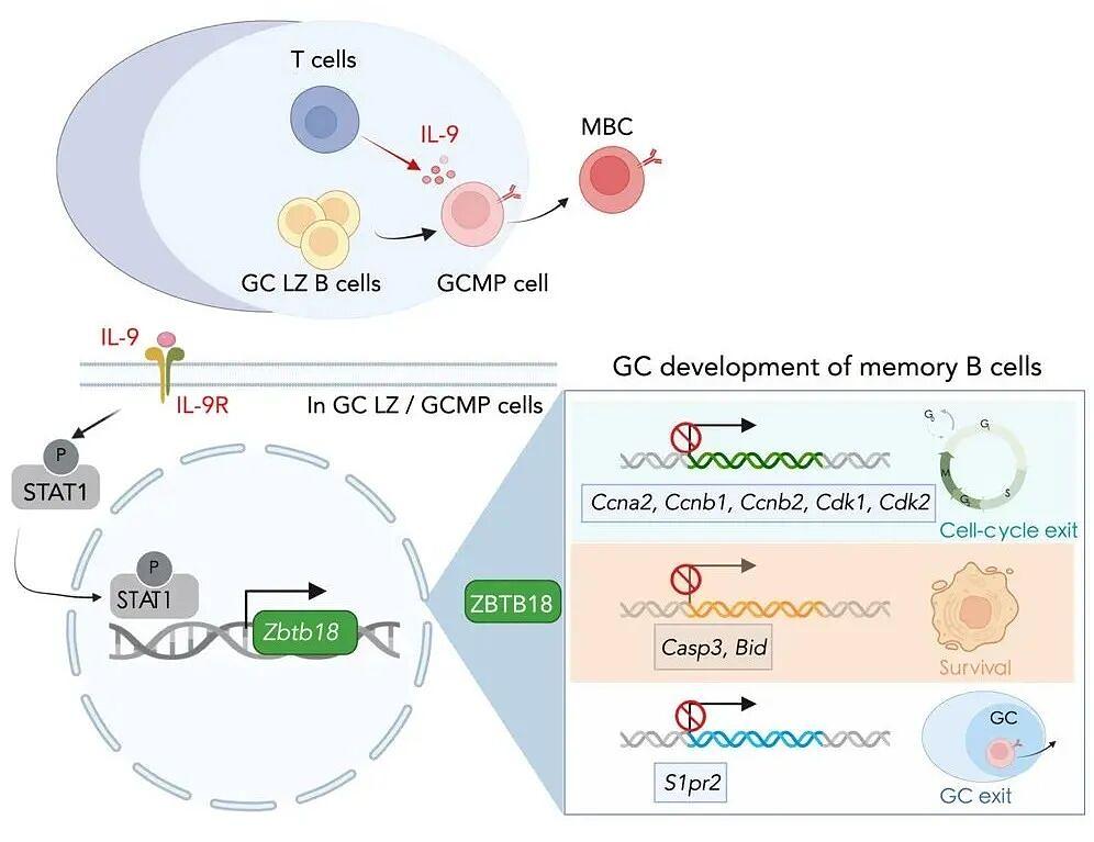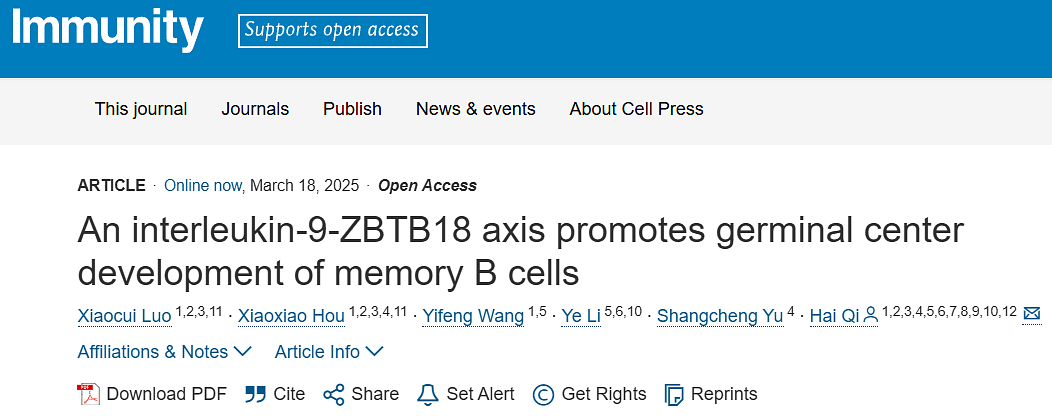 2025年3月18日,来自清华大学医学院、清华大学基础医学院、清华大学免疫学研究所的祁海教授团队在Immunity上发表了题为“An interleukin-9-ZBTB18 axis promotes germinal center development of memory B cells”的研究论文,首次报道了T细胞分泌的白细胞介素-9(IL-9)通过诱导转录因子ZBTB18表达,促进生发中心(GC)B细胞向记忆B细胞的定向分化与功能成熟。