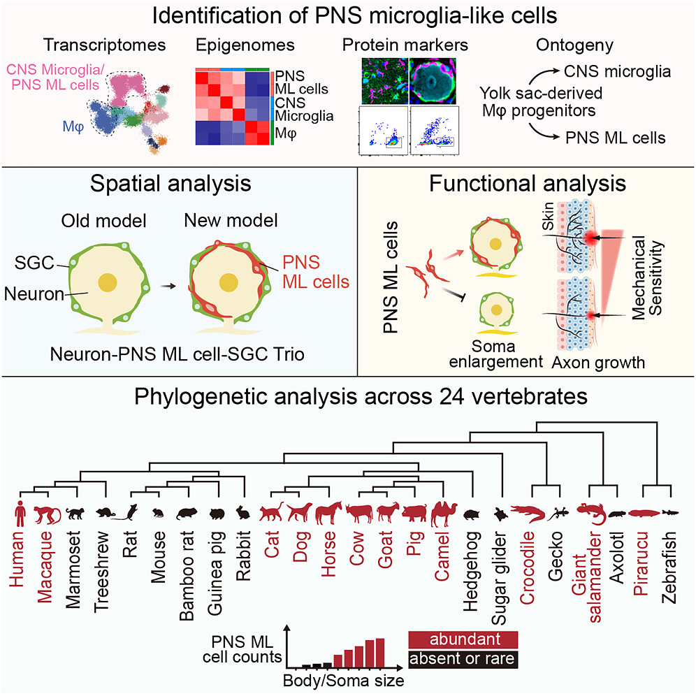 为了探究PNS microglia的生理功能,研究团队利用人和猪的样本,通过体内外实验,发现清除PNS microglia会导致神经元胞体生长受阻、轴突生长减少以及机械感知敏感性下降,表明PNS microglia在调控神经元胞体增大、轴突生长及功能成熟中的重要作用。随后,研究团队还对24种脊椎动物(包括鱼类、两栖类、爬行类和哺乳类)进行了系统演化分析,揭示了PNS microglia的古老起源,并发现PNS microglia的分布与物种体型及神经元胞体大小呈显著正相关。体型较大的物种(如人、食蟹猴和猪)中,PNS microglia数量较多,外周神经元胞体较大,而体型较小的物种(如狨猴、小鼠和大鼠)中,这类细胞几乎不存在,外周神经元胞体也较小。这一演化模式揭示了PNS microglia经历了与物种体型大小相关的进化选择压力并参与了物种的外周神经系统适应性进化,在支撑大体型物种外周神经系统发育中扮演重要角色。