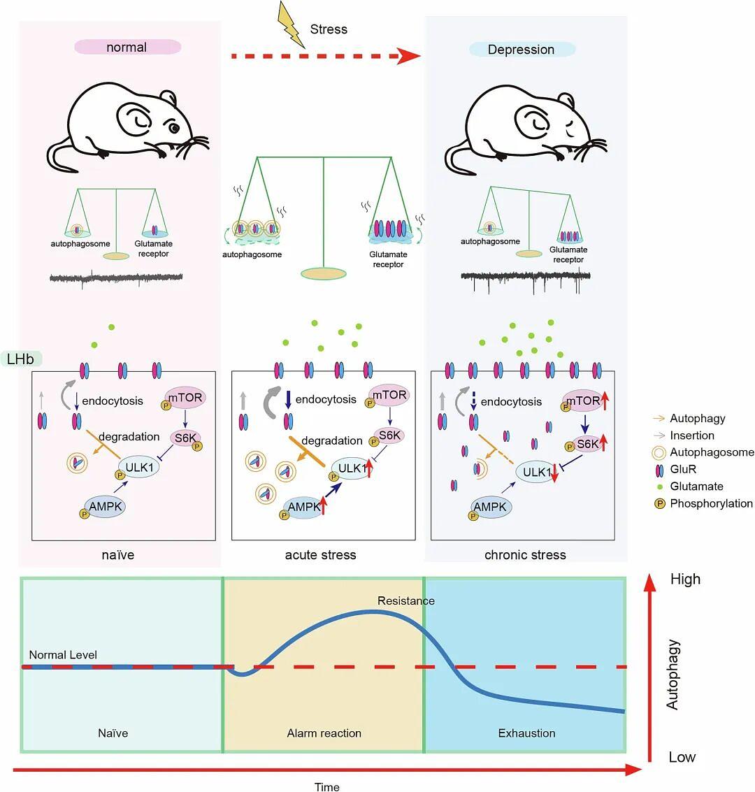 综上所述,本研究系统揭示了压力通过动态调控LHb神经元自噬影响抑郁发生的关键机制:急性/慢性应激分别通过AMPK/mTOR信号通路双向调节自噬活性,而自噬功能状态直接决定抑郁易感性。研究发现LHb自噬通过选择性降解谷氨酸受体调控突触可塑性,其增强可产生快速持久的抗抑郁效果。该研究证实LHb自噬是多种抗抑郁药物的共同作用靶点,不仅为理解抑郁症发病机制提供了新视角,更为开发靶向自噬的新型抗抑郁策略奠定了理论基础。这一突破性发现为克服现有抗抑郁药物起效慢、疗效有限等临床难题的解决开辟了新方向。