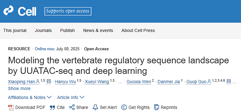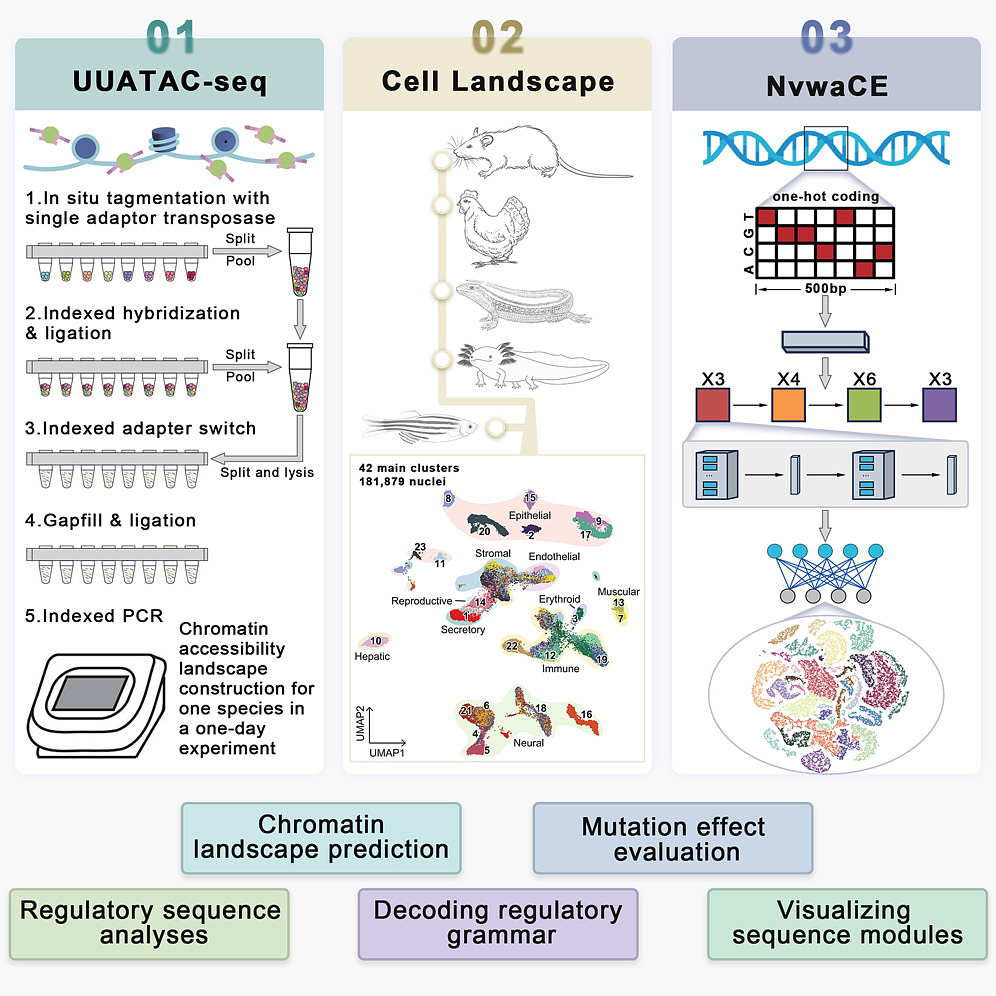 2025年7月8日,浙江大学医学院/良渚实验室郭国骥教授团队在 Cell 期刊发表了题为 “Modeling the vertebrate regulatory sequence landscape by UUATAC-seq and deep learning” 的研究论文,报告了一项具有里程碑意义的突破。该研究不仅开发了全球首个 超高通量、超高灵敏度的单核染色质可及性测序技术 UUATAC-seq(ultra-throughput ultra-sensitive single-nucleus ATAC-seq),还构建了深度学习模型 女娲CE(NvwaCE),首次实现了从基因组序列直接预测单细胞水平的染色质可及性图谱,为解码脊椎动物基因组的调控“语法”提供了革命性工具。