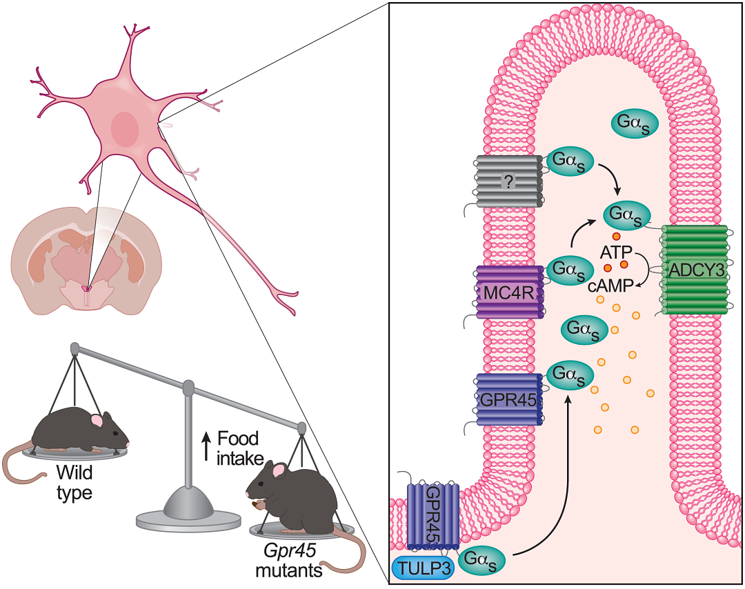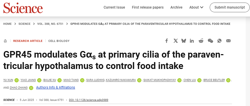 2025年6月5日,德克萨斯大学西南医学中心张召教授团队在《Science》发表题为 “GPR45 modulates Gαs at primary cilia of the paraventricular hypothalamus to control food intake” 的研究成果。该研究揭示了一种名为 GPR45 的 G蛋白偶联受体(GPCR) 在中枢调控进食行为中的关键作用。研究发现,GPR45 并不直接参与传统意义上的信号转导,而是通过将信号分子 Gαs 精准定位至神经元的初级纤毛(primary cilia),从而调控食欲相关信号的“空间定位”。若这一过程发生异常,饱腹信号会被阻断,导致大脑误判机体处于饥饿状态,进而引发持续进食,最终促进肥胖 的发生。