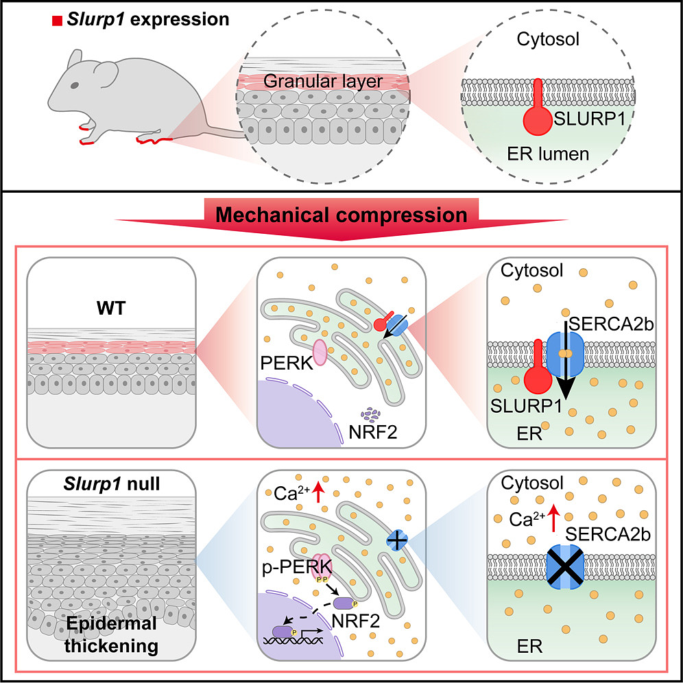 综合上述结果,我们提出以下分子机制:掌跖部位长期承受的机械力会抑制钙泵SERCA2b的功能,导致胞质内Ca²⁺浓度升高,进而激活pPERK-NRF2信号通路,最终引发表皮病理性增厚。而特异性表达于掌跖表皮颗粒层细胞中的ER膜蛋白SLURP1,能够在机械压力条件下维持SERCA2b的功能,稳定细胞内钙稳态,从而保障表皮组织的正常稳态。