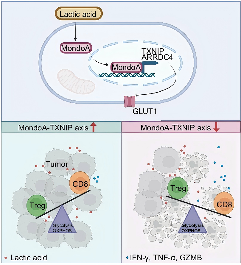 转录因子MondoA含有葡萄糖感应结构域,能够监测细胞内葡萄糖水平与能量状态,进而调控糖脂代谢相关基因的转录。然而,MondoA在免疫细胞代谢重编程与功能调控中的作用仍缺乏系统性研究。童雪梅团队此前发现,靶向MondoA–TXNIP轴可增强调节性T细胞(Treg)的葡萄糖摄取与糖酵解活性,从而削弱其免疫抑制功能;同时,MondoA的磷酸化修饰是其核质转运的关键调控机制。在此基础上,本研究进一步揭示MondoA–TXNIP轴是乳酸诱导的免疫抑制微环境中的关键代谢检查点,为癌症免疫治疗提供了新的干预策略。