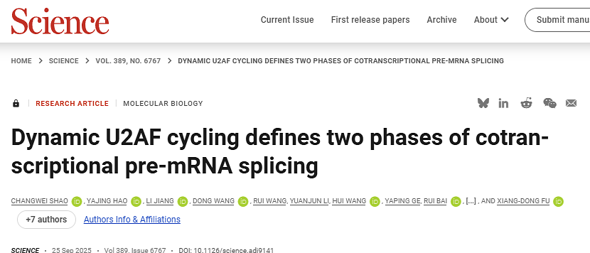 2025年9月26日,西湖大学付向东团队在《Science》发表了题为 “Dynamic U2AF cycling defines two phases of cotranscriptional pre-mRNA splicing” 的研究论文,首次揭示RNA聚合酶II(Pol II)作为唯一能“线性扫描”剪接位点的分子机器,通过“U2AF蛋白的动态循环”精准识别真剪接位点的机制。这一发现为理解基因表达调控提供了全新的分子视角。