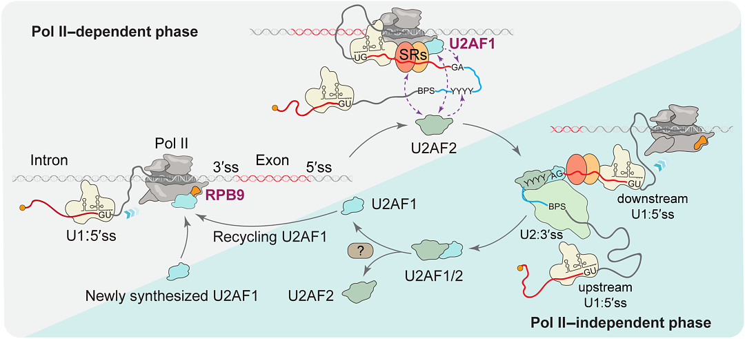 传统观点认为,U2AF1与U2AF2始终以稳定的异源二聚体形式参与剪接过程。然而,本研究首次揭示,U2AF1实际上以单体形式直接结合于Pol II上;随后U2AF2再以单体形式加入,与U2AF1组装为异源二聚体,进而触发剪接起始复合物从Pol II释放,进入后续的剪接体组装与催化阶段。该发现突破了以往对U2AF蛋白作用机制的认知,揭示其在剪接过程中存在“动态循环”。