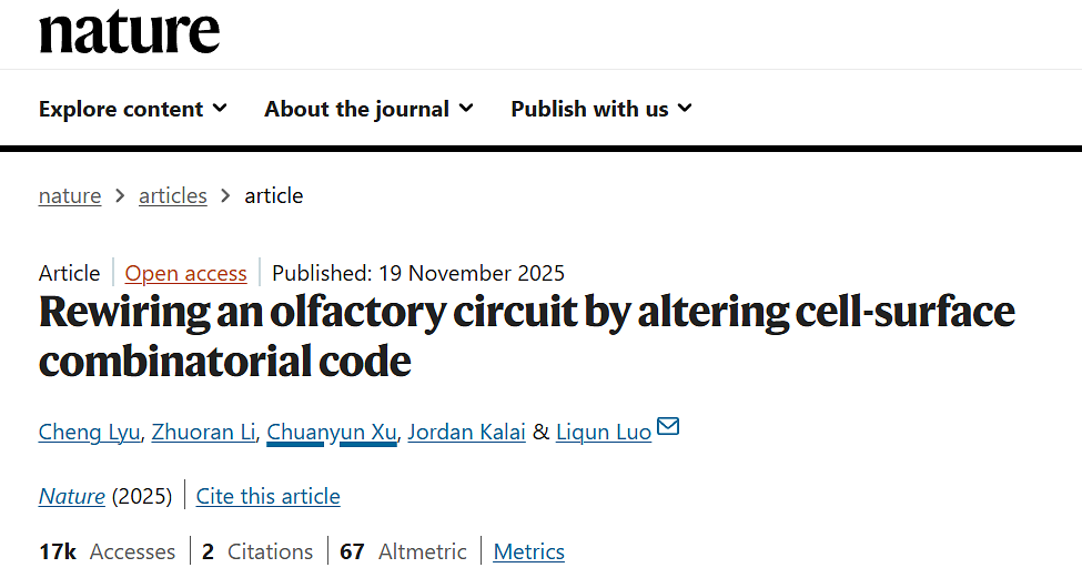 2025 年 11 月 19 日,斯坦福大学骆利群团队(博士后吕程与博士生李卓然为共同第一作者)在顶级期刊《Nature》上背靠背发表两篇论文——Repulsions instruct synaptic partner matching in an olfactory circuit 和 Rewiring an olfactory circuit by altering cell-surface combinatorial code。他们以结构精密的果蝇嗅觉系统为模型,不仅首次系统阐明细胞表面蛋白的组合密码是决定突触特异性的核心分子逻辑,更史无前例地证明,通过理性重写这套密码,即可可预测地、程序化地重构神经连接。这两项工作相辅相成,标志着我们对于神经连接建立机制的理解,已从传统的描述性研究,正式迈入了可编程、可调控的全新阶段。